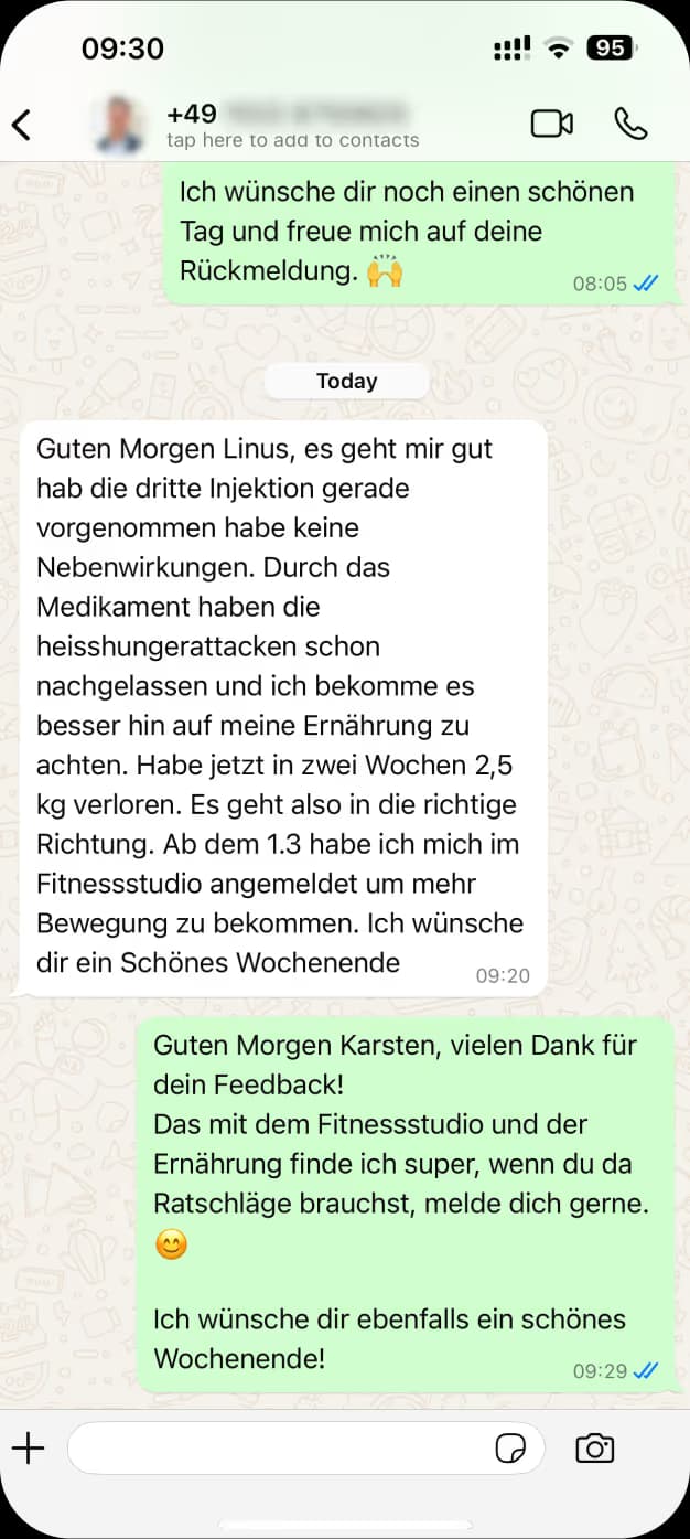 Alles inklusive für nachhaltigen Erfolg: die revolutionäre Abnehmspritze, 1:1 WhatsApp-Support, Fortschritts-Tracking und unseren umfassenden Videokurs - alles ohne Mindestvertragslaufzeit.